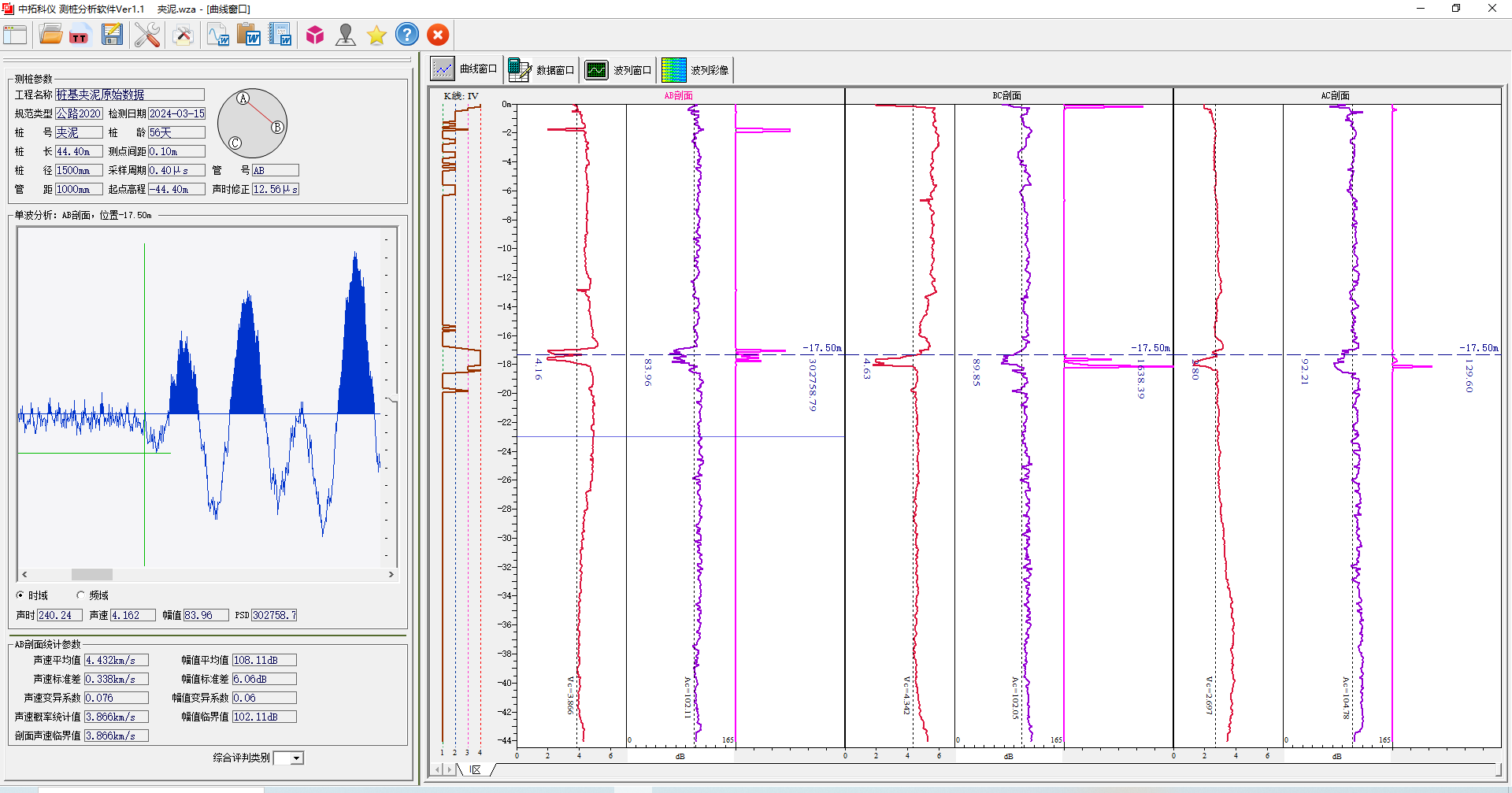 海南某桩基夹泥实例 海南某桩基后期数据处理中,分析波形数据判断为夹泥情况。在18米位置三个剖面均出现声速值,声幅值异常的情况,但是又异于断桩数据情况,在分析当时的浇灌混凝土情况,判断为此位置夹泥。于是在桩基中心位置钻孔到18米位置,出现了冒水的情况,在抽水之后系人员下孔,确实为夹泥。